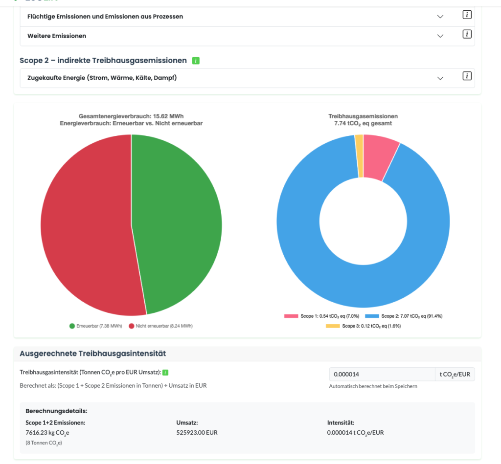 Unsere KI berechnet Kennzahlen wie den CO2-Fußabdruck (Scope 1, 2 und 3) auf Basis Ihrer Eingaben und prüft Ihre Eingaben auf Plausibilität. Sie sparen sich manuelle Berechnungen und vermeiden Fehler.