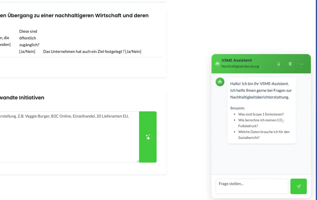 Erfassen Sie die relevanten Daten gemäß der Struktur des VSME Standards ein. Hilfetexte unterstützen Sie bei der korrekten und konformen Eingabe – auch ohne Vorwissen!
