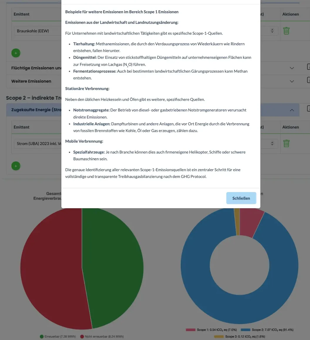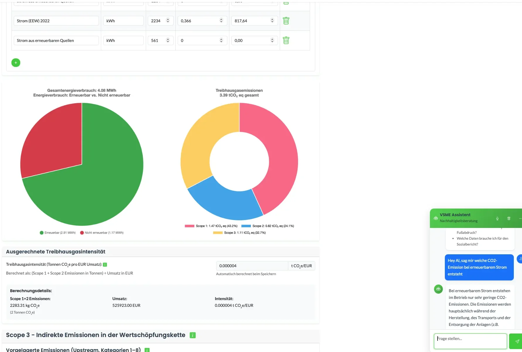 Geben Sie geführt Daten zu Themen wie Energieverbrauch, Fuhrpark und weitere Emittenten aus Ihrem Unternehmen ein. Hilfetexte unterstützen Sie bei der Eingabe und unser eingebauter KI-Assistent hilft Ihnen bei der Identifikation der Emittenten. Unsere Software berechnet die relevanten Kennzahlen und Tonnen CO2-Äquivalent.